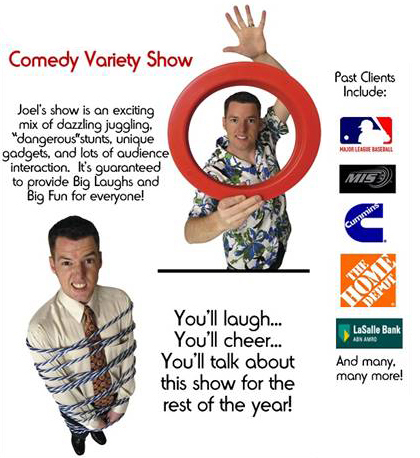 Joel’s Variety Show is a HUGE hit with family audiences everywhere!  Dazzling juggling, amazing magic, goofy stunts, wacky music, and LOTS of audience participation highlight this exciting show.  This interactive show is 45 minutes long and comes complete with a professional sound system, colorful backdrops, and all necessary equipment.  Joel’s lively performance can fill an entire stage or fit into the smallest corner; either way, Joel will put on an amazing performance that your group will love!